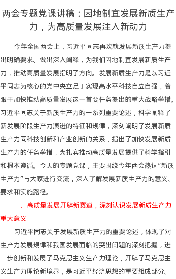 两会专题党课讲稿:因地制宜发展新质生产力,为高质量发展注入新动力