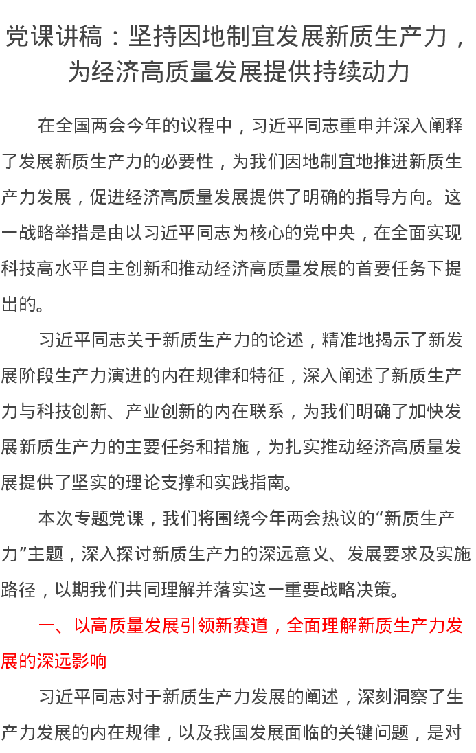 党课讲稿:坚持因地制宜发展新质生产力,为经济高质量发展提供持续动力
