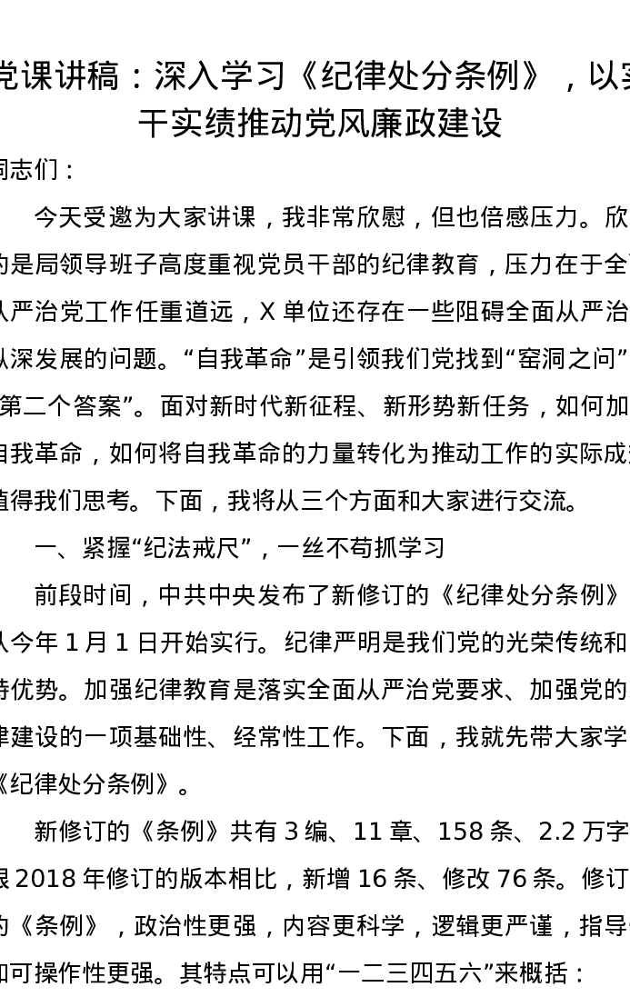 党课讲稿:深入学习《纪律处分条例》,以实干实绩推动党风廉政建设