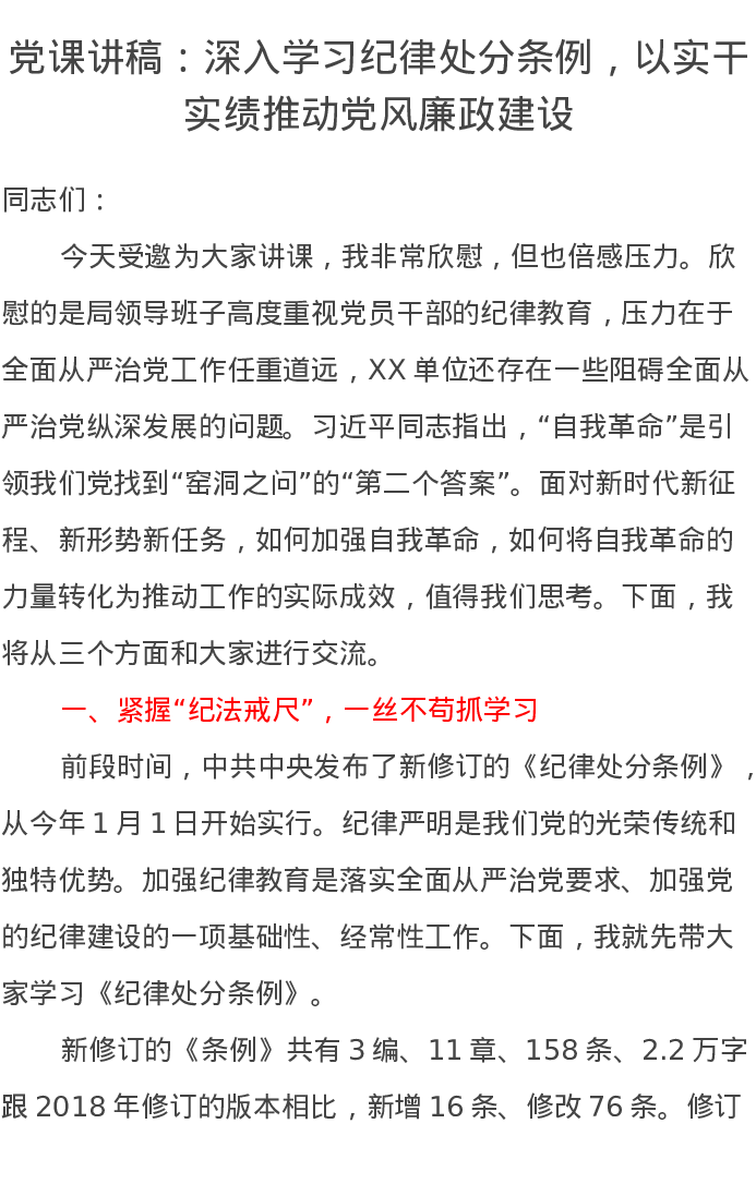 党课讲稿:深入学习纪律处分条例,以实干实绩推动党风廉政建设