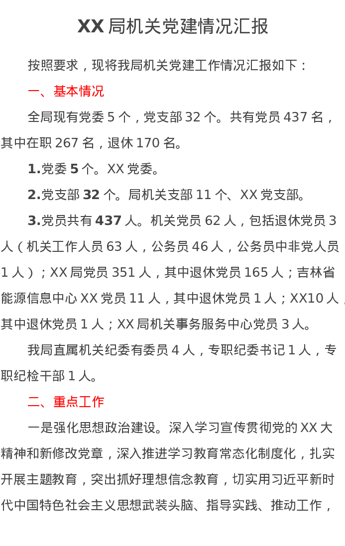 XX局机关党建情况汇报