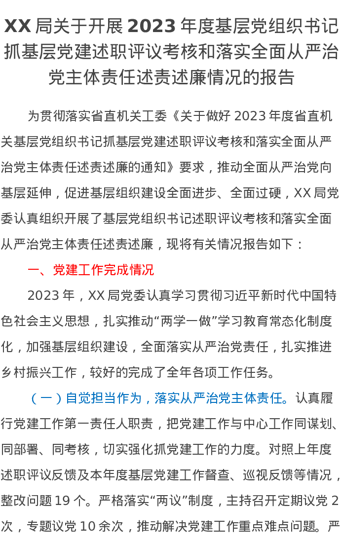 XX局关于开展2023年度基层党组织书记抓基层党建述职评议考核和落实全面从严治党主体责任述责述廉情况的报告
