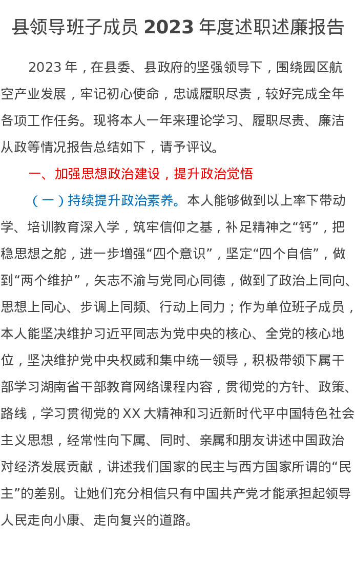 县领导班子成员2023年度述职述廉报告