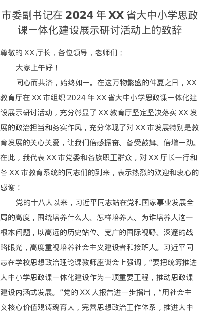 市委副书记在2024年XX省大中小学思政课一体化建设展示研讨活动上的致辞