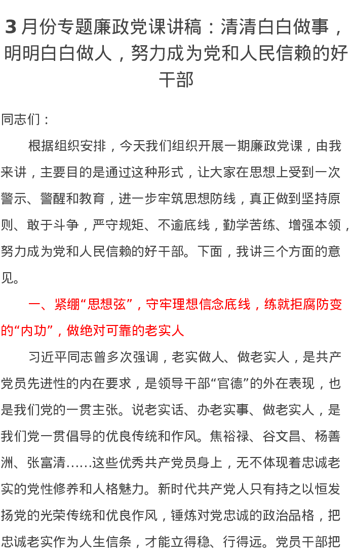 3月份专题廉政党课讲稿:清清白白做事,明明白白做人,努力成为党和人民信赖的好干部