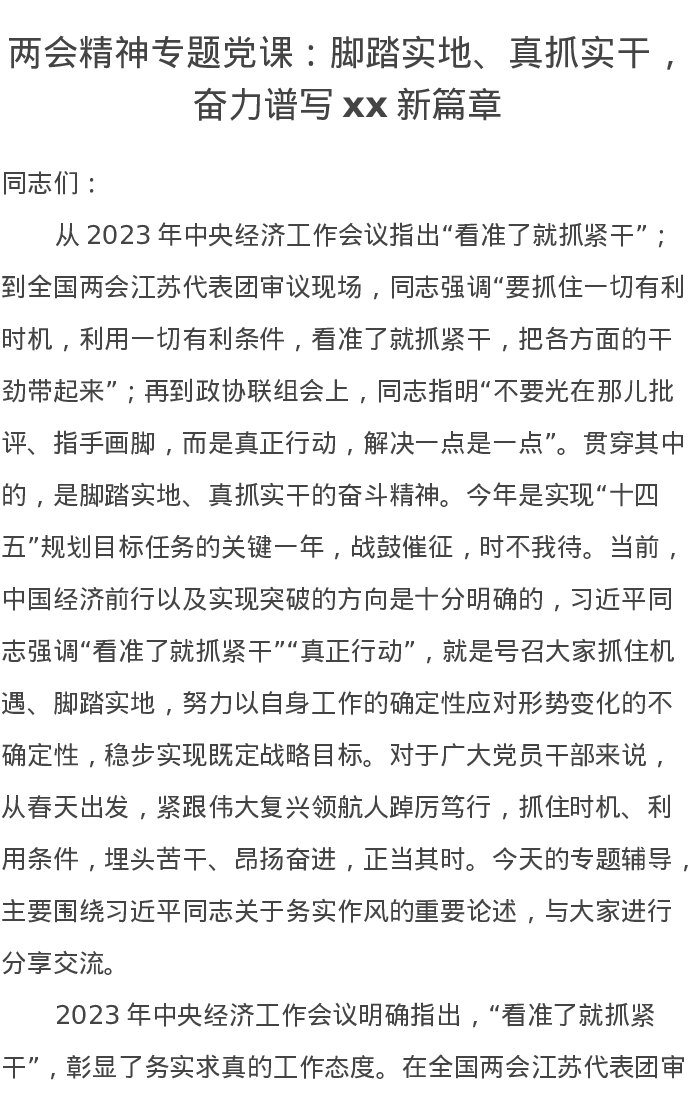 两会精神专题党课:脚踏实地、真抓实干,奋力谱写xx新篇章
