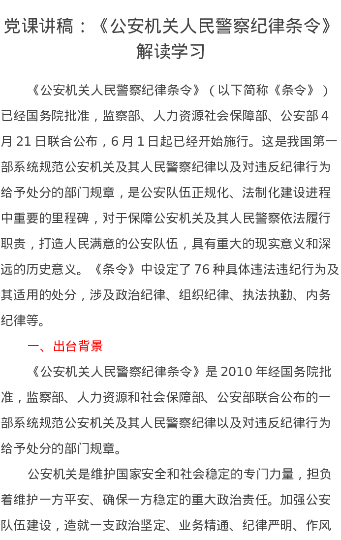 党课讲稿:《公安机关人民警察纪律条令》解读学习
