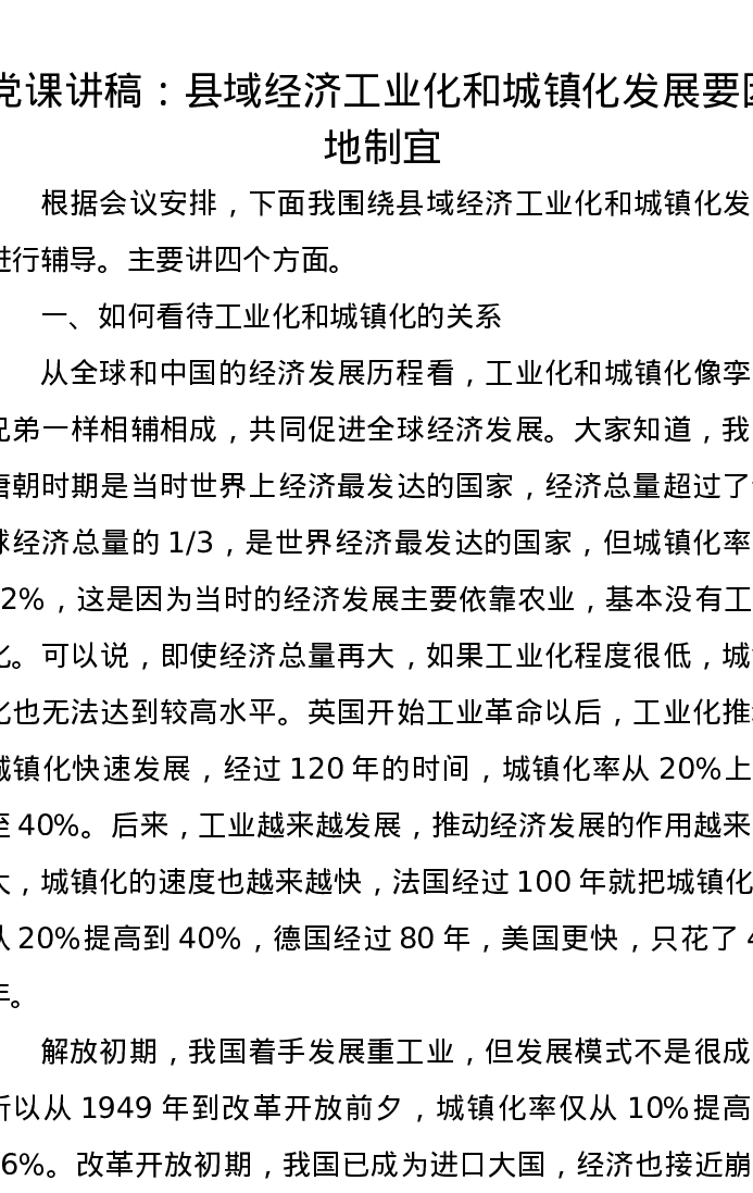 党课讲稿:县域经济工业化和城镇化发展要因地制宜