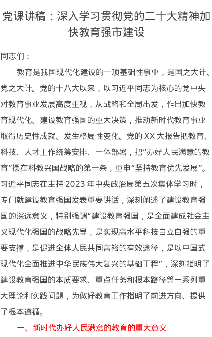 党课讲稿:深入学习贯彻党的二十大精神加快教育强市建设