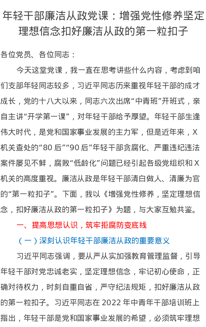 年轻干部廉洁从政党课讲稿:增强党性修养坚定理想信念扣好廉洁从政的第一粒扣子