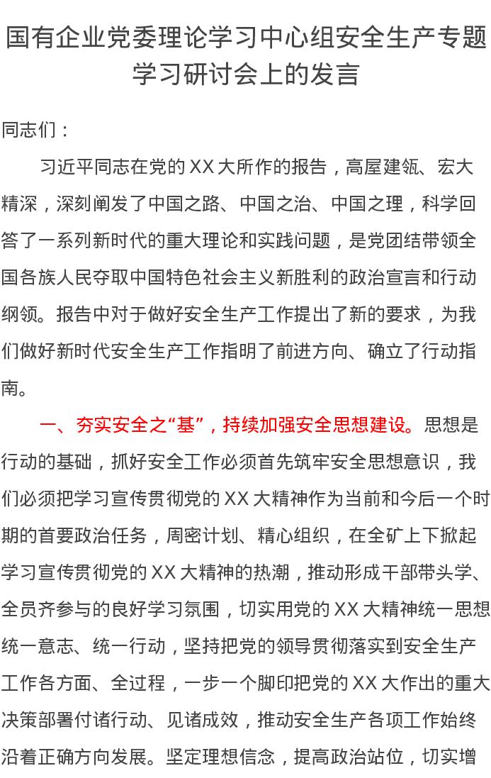 国有企业党委理论学习中心组安全生产专题学习研讨会上的发言
