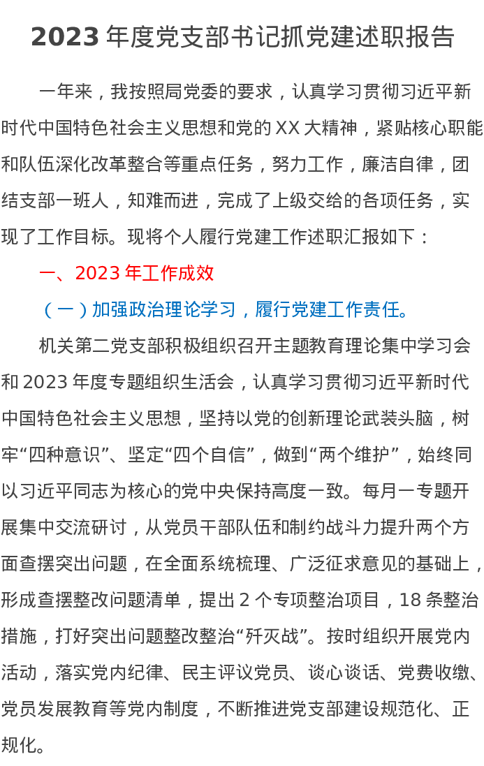 2023年度党支部书记抓党建述职报告