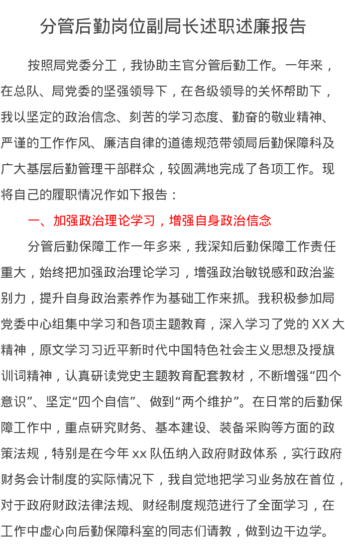 分管后勤岗位副局长述职述廉报告