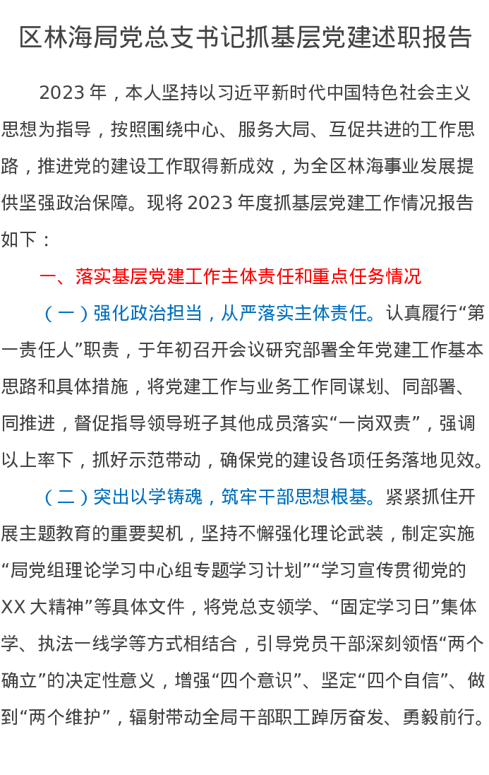 区林海局党总支书记抓基层党建述职报告