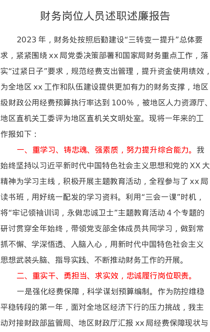财务岗位人员述职述廉报告
