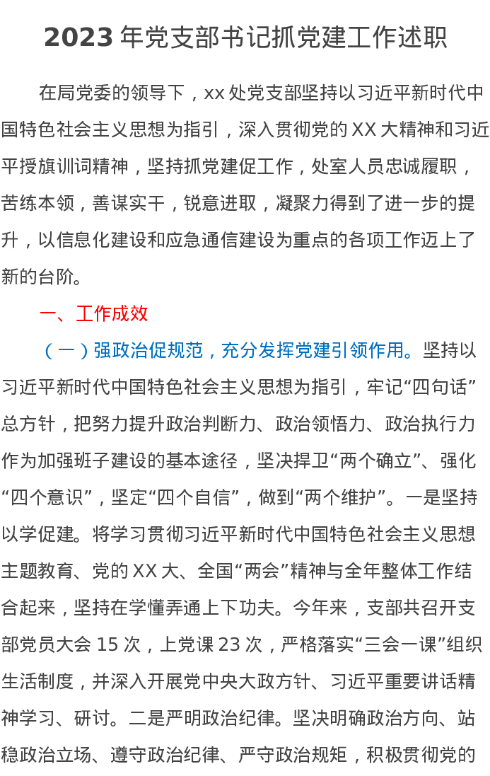 2023年党支部书记抓党建工作述职报告