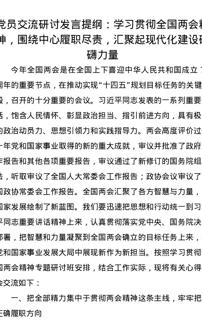 党员交流研讨发言提纲:学习贯彻全国两会精神,围绕中心履职尽责,汇聚起现代化建设磅礴力量