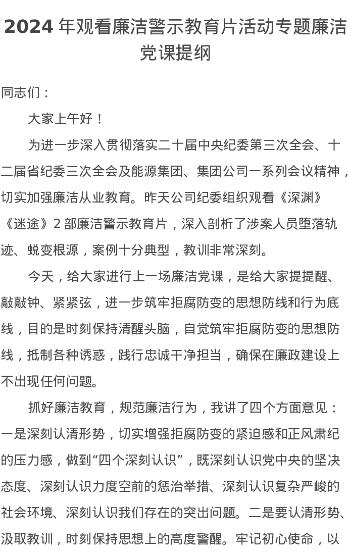 2024年观看廉洁警示教育片活动专题廉洁党课提纲