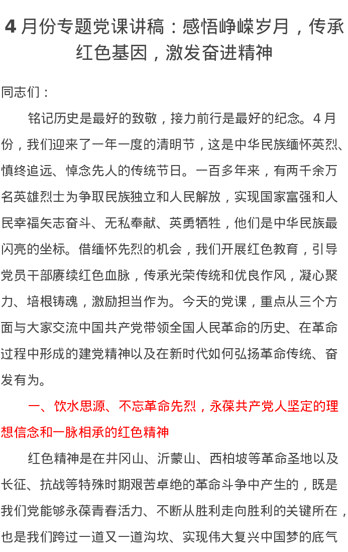 4月份专题党课讲稿:感悟峥嵘岁月,传承红色基因,激发奋进精神