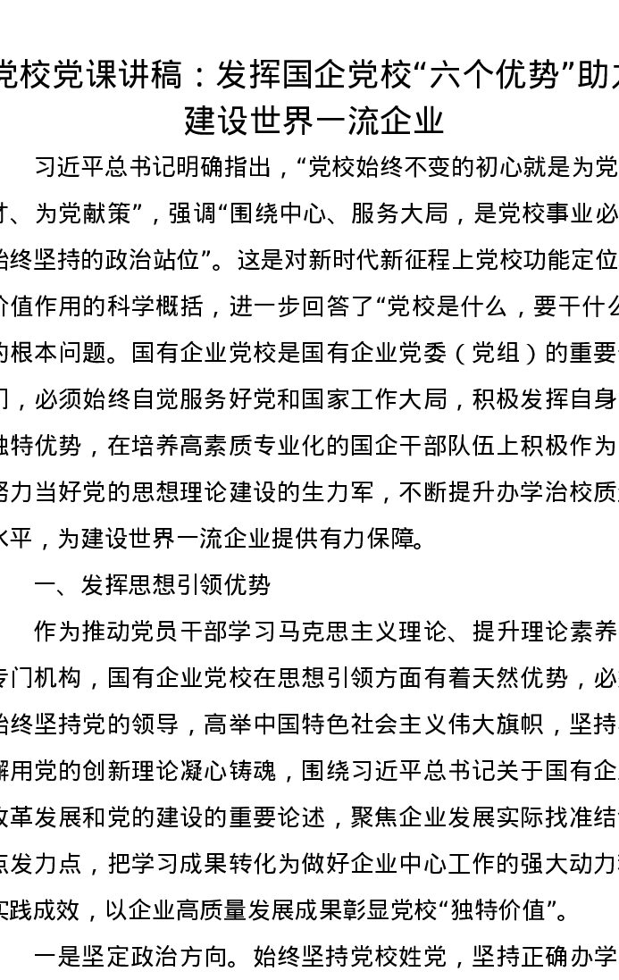 党校党课讲稿:发挥国企党校“六个优势”助力建设世界一流企业