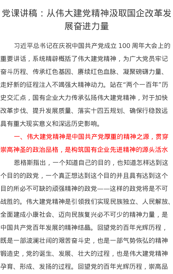 党课讲稿:从伟大建党精神汲取国企改革发展奋进力量