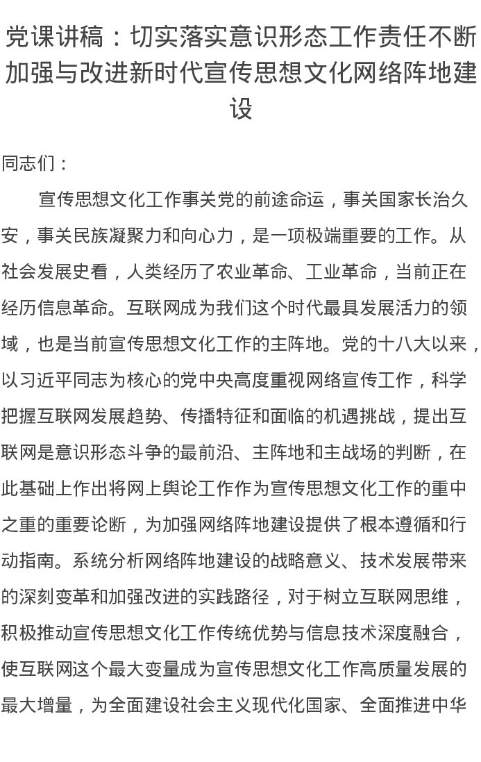 党课讲稿:切实落实意识形态工作责任不断加强与改进新时代宣传思想文化网络阵地建设