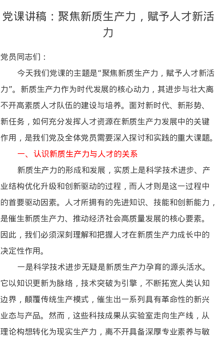 党课讲稿:聚焦新质生产力,赋予人才新活力