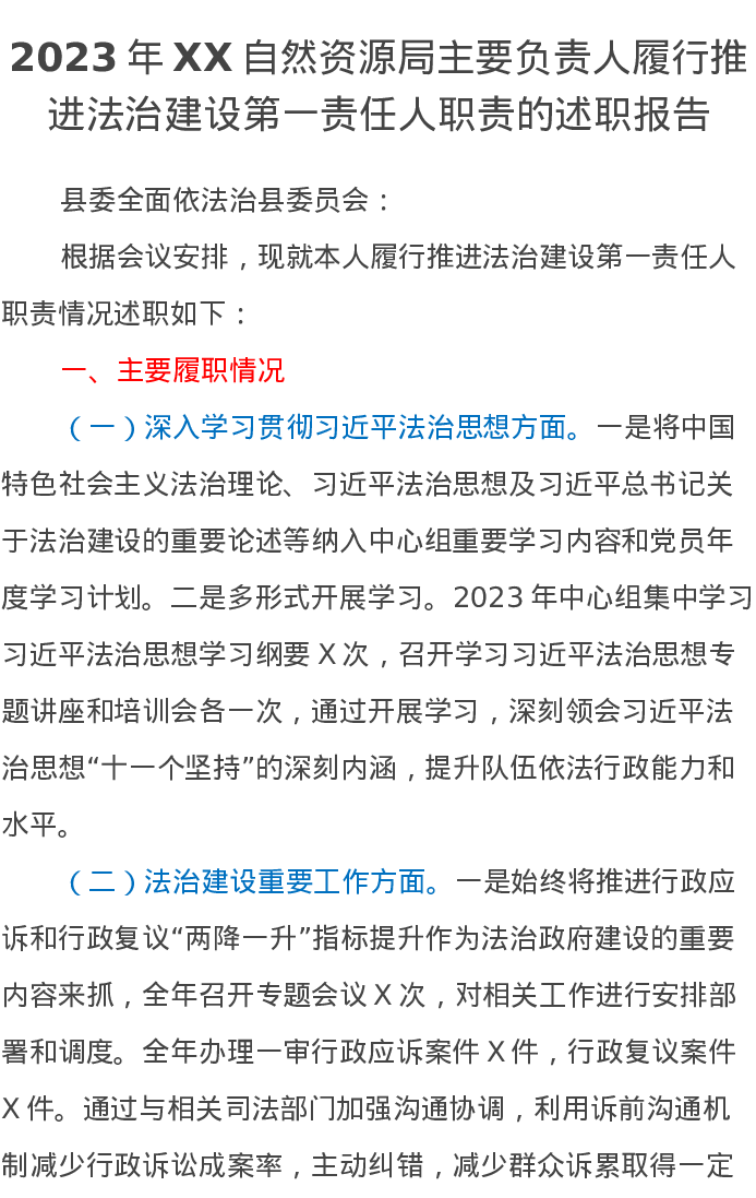 2023年XX自然资源局主要负责人履行推进法治建设第一责任人职责的述职报告