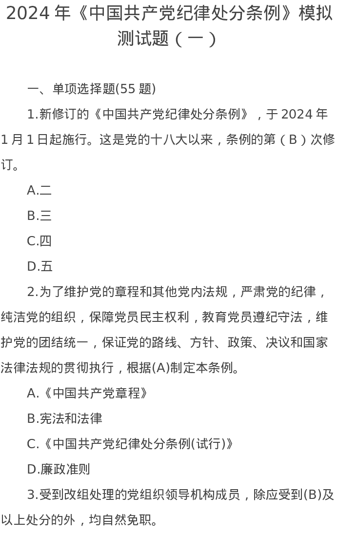2024年《中国共产党纪律处分条例》模拟测试题(一)