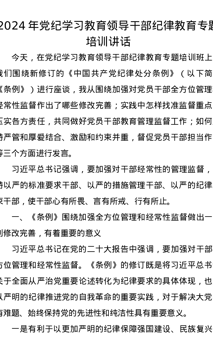 2024年党纪学习教育领导干部纪律教育专题培训讲话