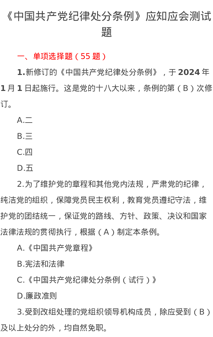 党纪学习教育—《中国共产党纪律处分条例》应知应会测试题