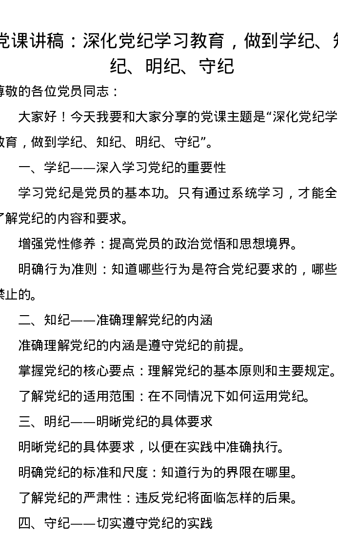 党课讲稿:深化党纪学习教育,做到学纪、知纪、明纪、守纪