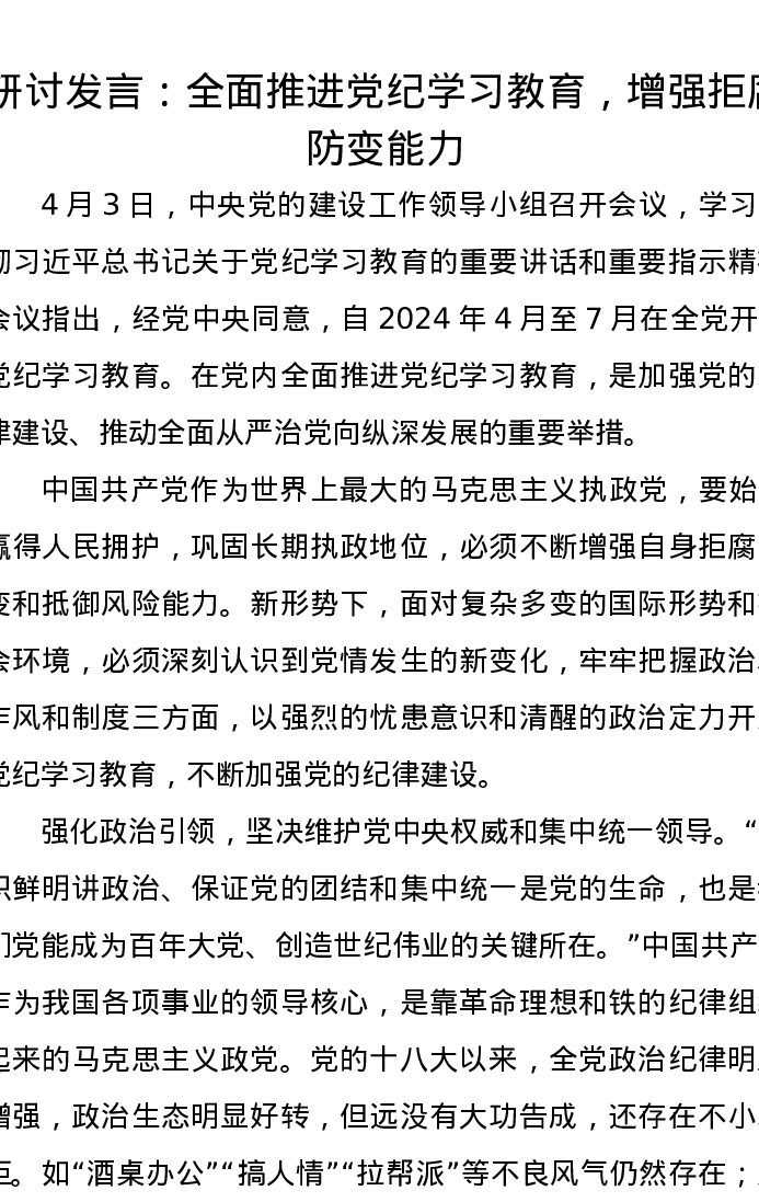 研讨发言:全面推进党纪学习教育,增强拒腐防变能力