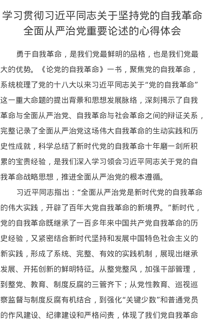 学习贯彻习近平总书记关于坚持党的自我革命全面从严治党重要论述的心得体会