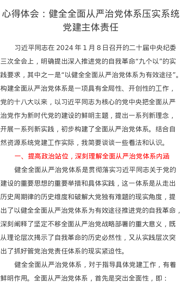 心得体会:健全全面从严治党体系压实系统党建主体责任