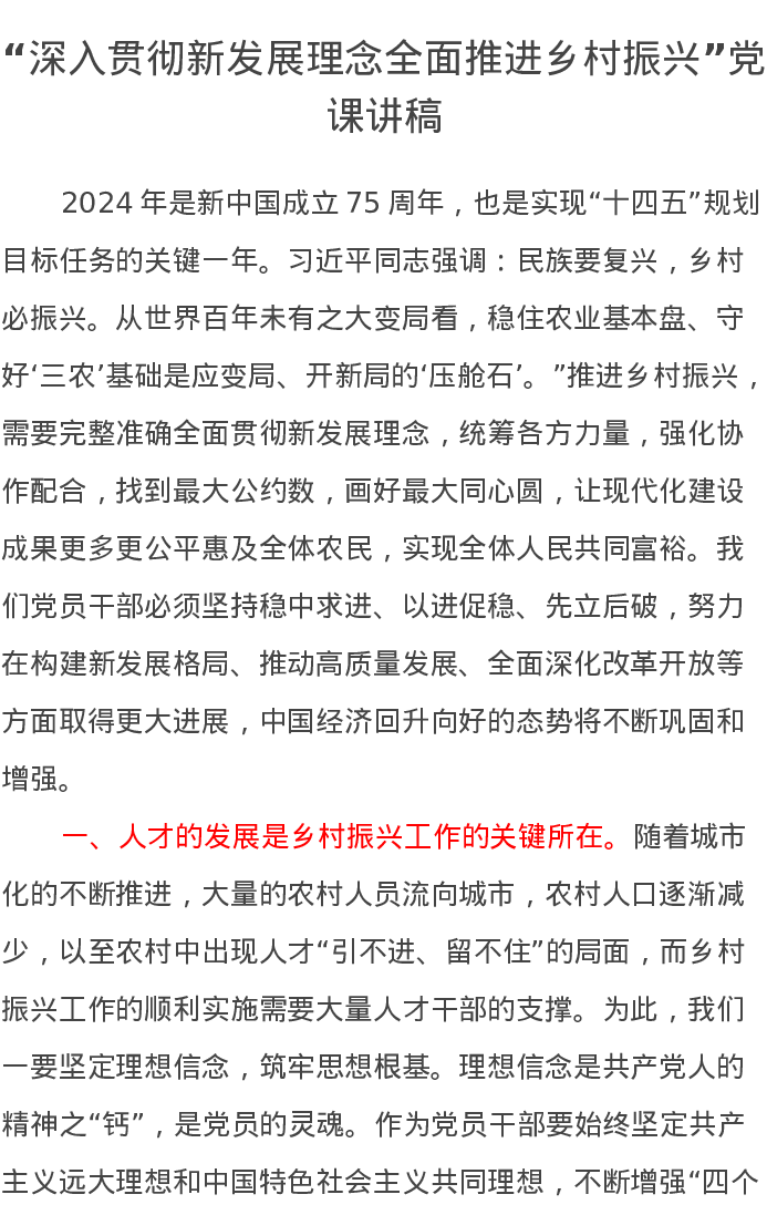 “深入贯彻新发展理念全面推进乡村振兴”党课讲稿