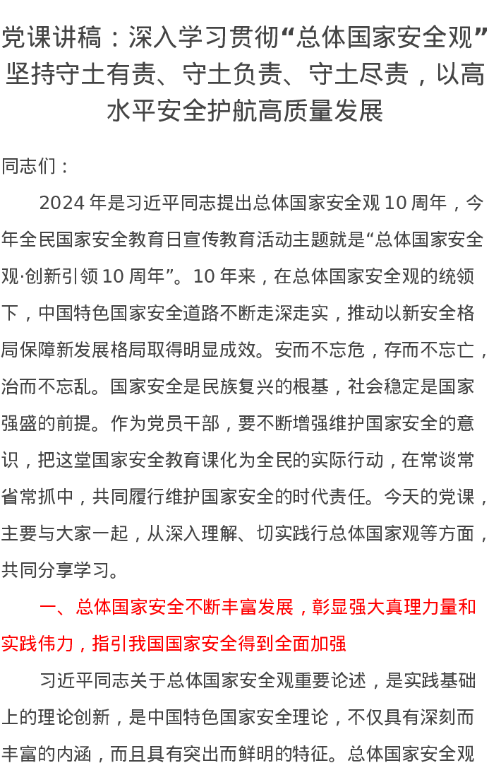 党课讲稿:深入学习贯彻“总体国家安全观”,坚持守土有责、守土负责、守土尽责,以高水平安全护航高质量发展