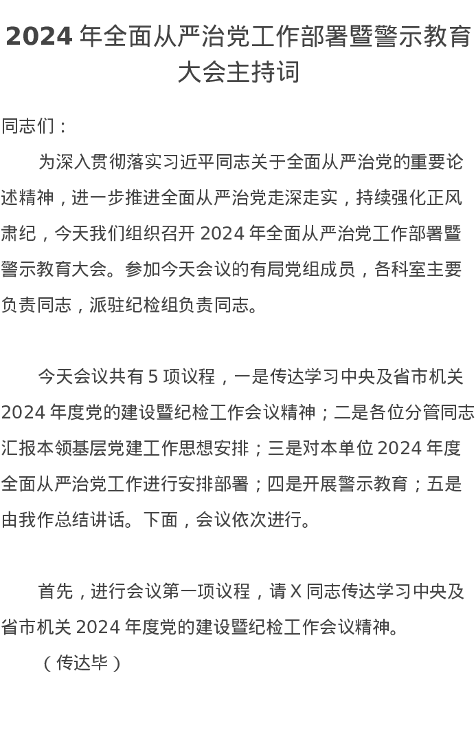 2024年全面从严治党工作部署暨警示教育大会主持词