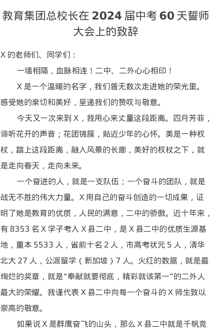教育集团总校长在2024届中考60天誓师大会上的致辞