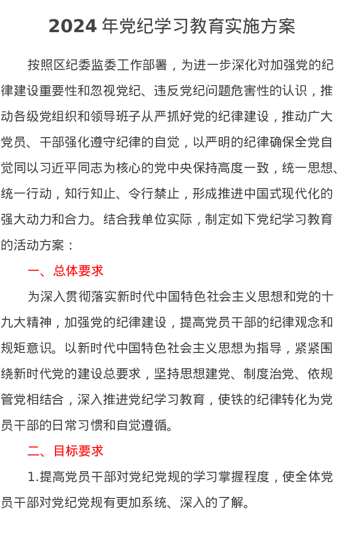 2024年党纪学习教育实施方案