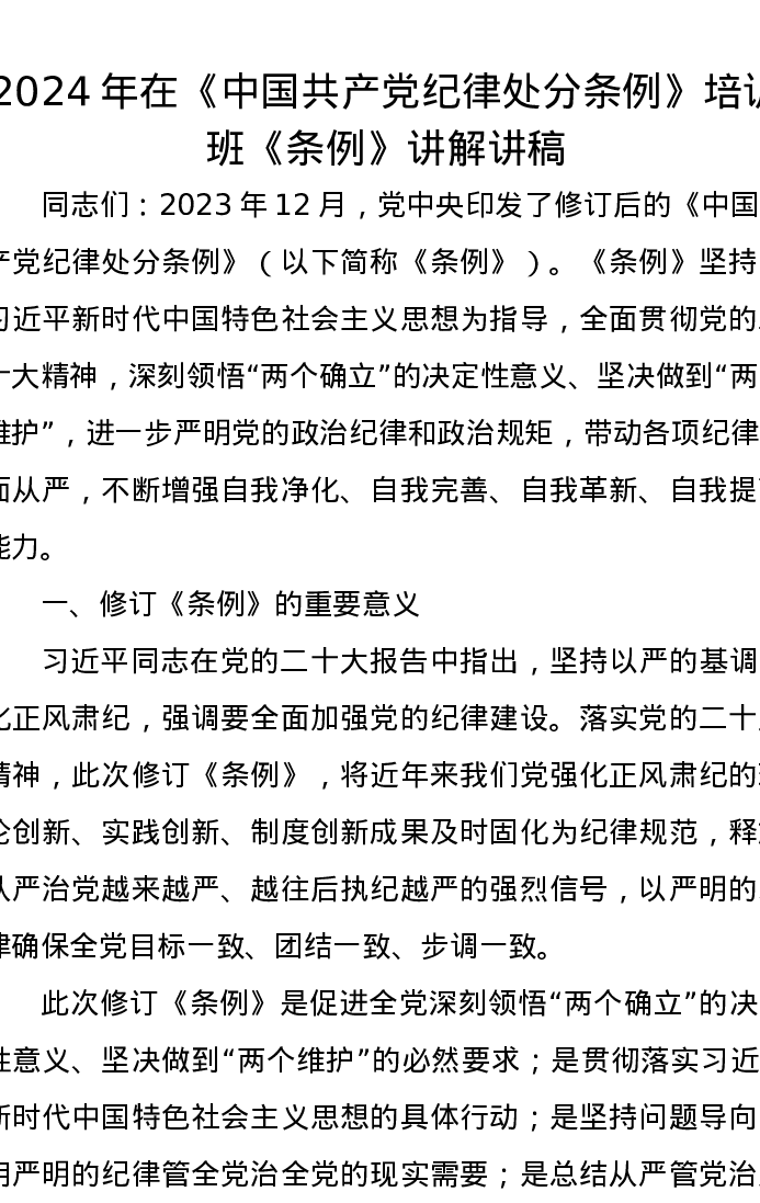 2024年在《中国共产党纪律处分条例》培训班《条例》讲解讲稿