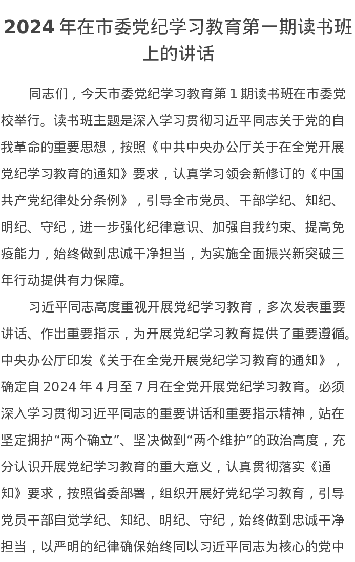2024年在市委党纪学习教育第一期读书班上的讲话