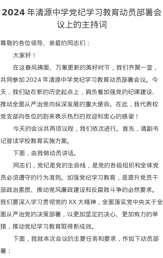 2024年清源中学党纪学习教育动员部署会议上的主持词