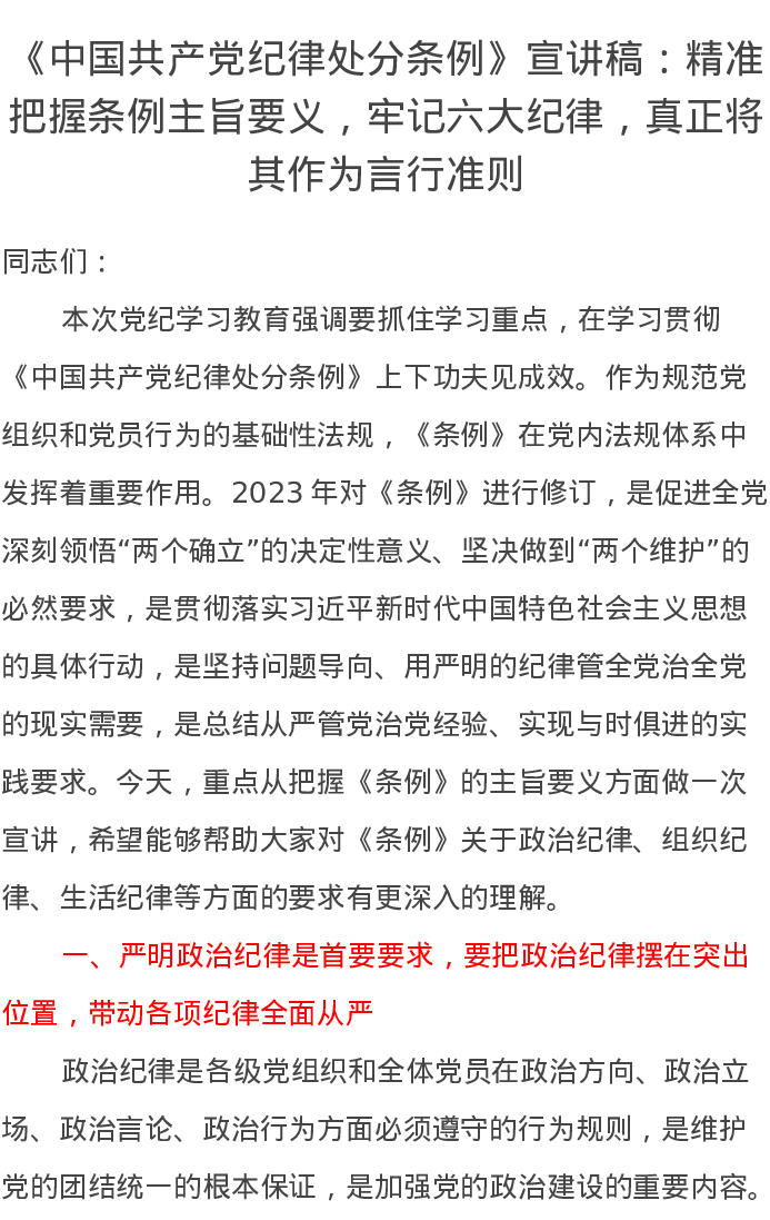 《中国共产党纪律处分条例》宣讲稿:精准把握条例主旨要义,牢记六大纪律,真正将其作为言行准则