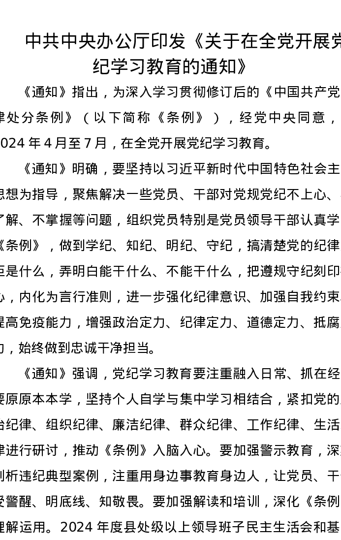 党纪学习教育∣01上级精神:02中共中央办公厅印发《关于在全党开展党纪学习教育的通知》
