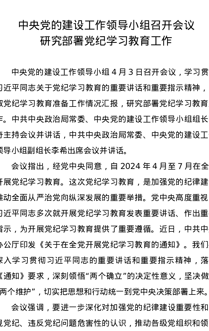党纪学习教育∣01上级精神:03中央党的建设工作领导小组会议研究部署党纪学习教育工作