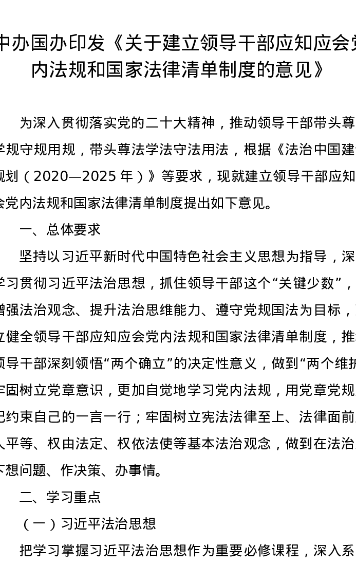 党纪学习教育∣01上级精神:06中办国办印发《关于建立领导干部应知应会党内法规和国家法律清单制度的意见》