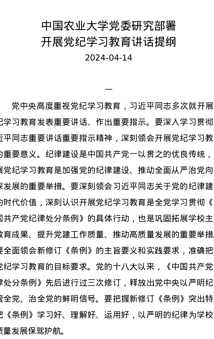党纪学习教育∣03领导讲话:中国农业大学党委研究部署开展党纪学习教育讲话提纲