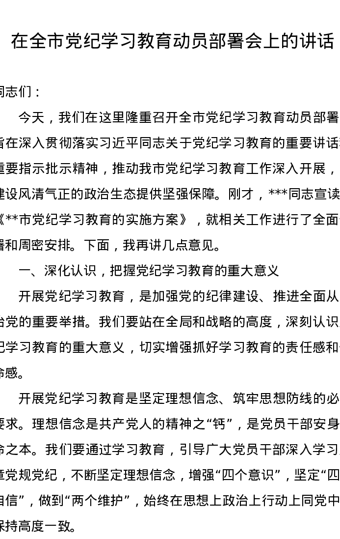 党纪学习教育∣03领导讲话:在全市党纪学习教育动员部署会上的讲话