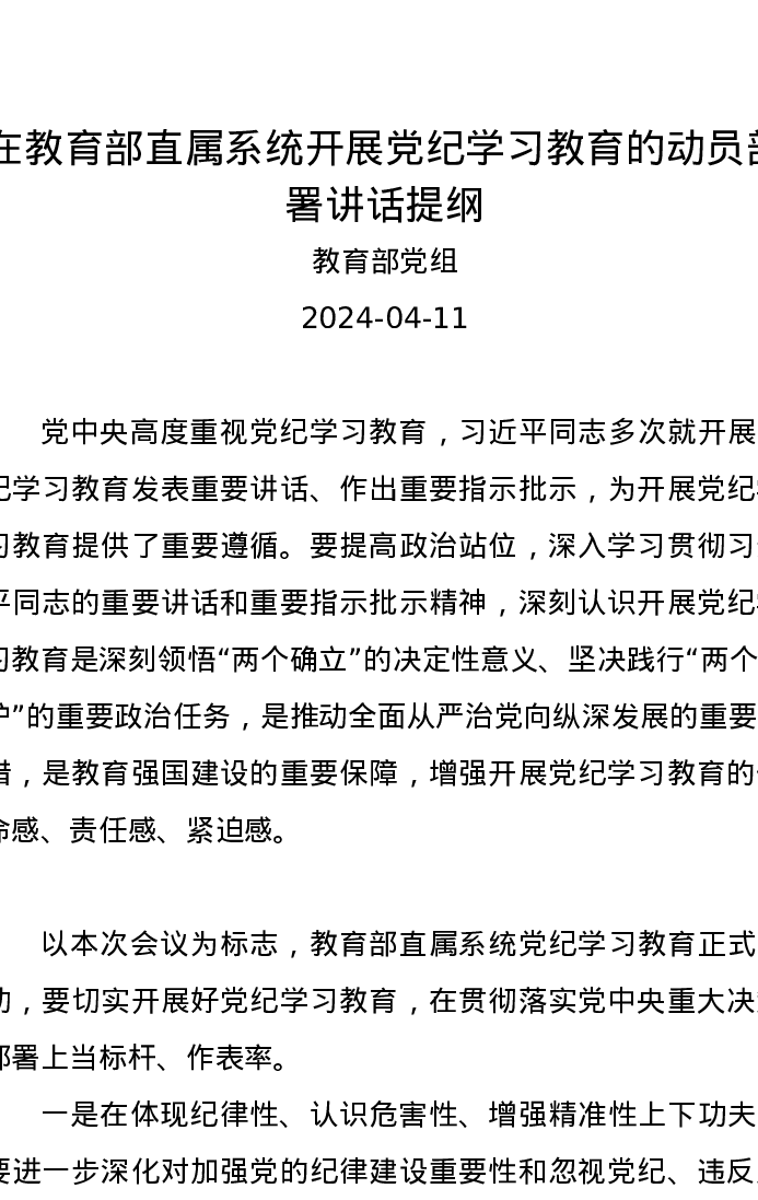 党纪学习教育∣03领导讲话:在教育部直属系统开展党纪学习教育的动员部署讲话提纲——教育部党组